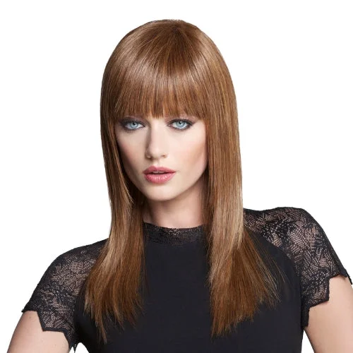 Featuring sleek precision-cut layers that fall below the shoulder with feathery blunt cut bangs. The circular knotting, monofilament mesh crown, and Cool Comfort Stretch back, top off this extraordinarily light, natural-looking stunning style.